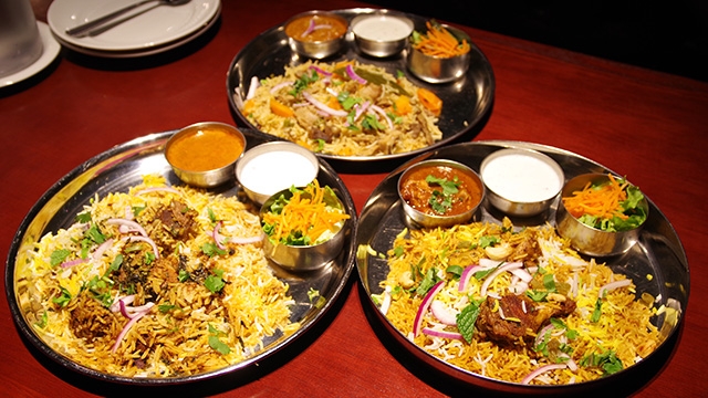 左がマトンビリヤニ、上が鴨プラオ、右がチキンビリヤニ。ぱっと見はみんな一緒に見える。