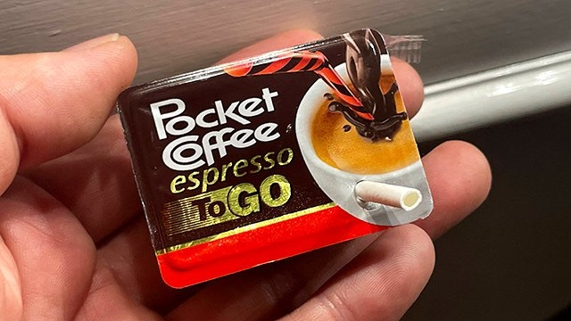 ここからが本題。コーヒー好きのイタリア人なので、カフェ(バール)以外でも飲みたいと思うのは当然のこと。そこで持ち運べるエスプレッソこと、ポケットコーヒー(Pocket Coffee espresso To GO)という独自商品が存在するのだと、イタリアの食文化に詳しい人から教わった。