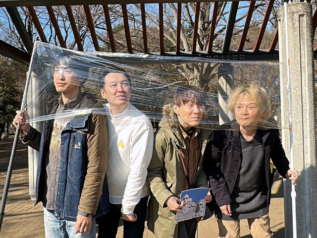 たまたま4人で歩いていると、正面に食品用ラップが張られていて、気づかずそこに顔を突っ込んでしまい、結果としてラシュモア山のようになっている。