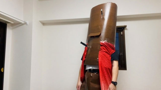 茶色いポリ袋を、着れるようにハサミとセロテープで切り貼りして頭の部分にフタをつけて完成!