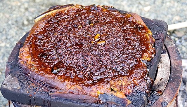 すっかり煮詰まって、午前中に見た味噌ダレ状態に仕上がっている。やっぱり鮎の石焼は、こういう食べ物なのである。きっと酒にも合うだろう。
