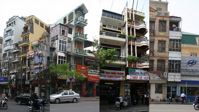 天高くそびえる3階~10階建てのベトナム建築。細長いからか、実際の高さよりもずっと高く見えるから不思議だ。全てのただ細いだけでなく、それぞれが細いという同じ条件を持ちながら、色や前面のデザインや機能に個性を持たせている。