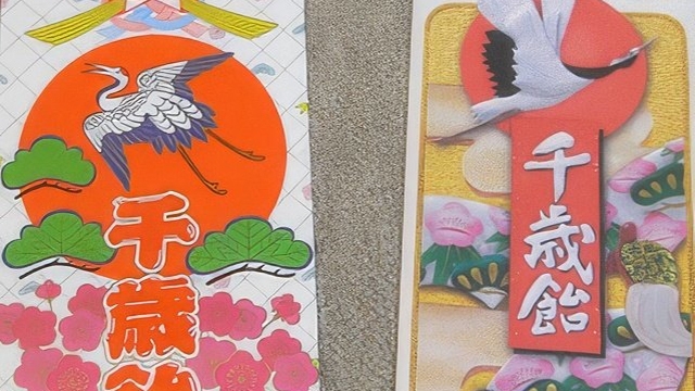 ペコちゃんやアンパンマン、店独自の現代的なデザインの千歳飴など並ぶ中、かろうじて昔ながらの面影を色濃く残すこれら2点が手に入った。これをお手本にしよう。
