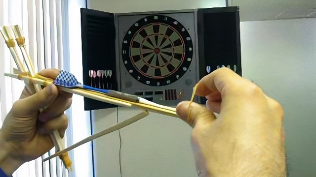 見たまんまだ。わりばし鉄砲の上に無理やりダーツが乗っている。こんなんでちゃんと飛ぶんだろうか?