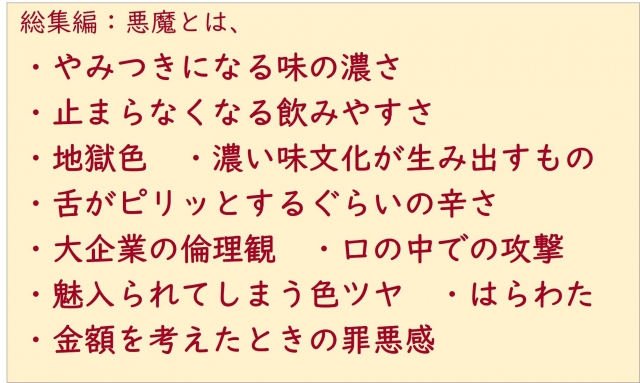肝心の「悪魔を分かる」についても、「やみつき」「止まらない」「飲みやすい」など一般的に思われている以上のことは見出せていない。