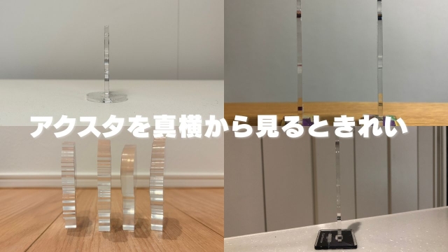 アクスタ3体、アクリル板6枚(台座含まず)。すべて真横のアングルで撮影するには、手前側をちょっと狭く、逆ハの字の形に並べる必要があります。テクニックです。
