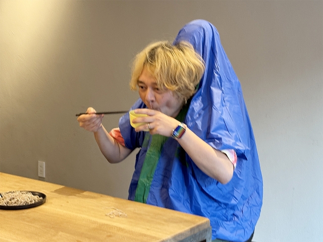 一人で二人羽織をすると、ある程度コントロールが効くので目からソバを食べようとするなど、派手な失敗ができます。やってるときも楽しそう。