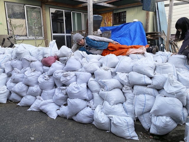 穴五郎さんも満足そうだ。積み上がった土のう袋の量もすごい。