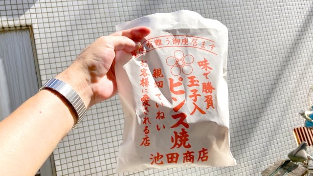 ピンス焼きの「ピンス」の由来には諸説があり、鉄板を「ピン」で留めて焼いていたからだとか、丸っこい形が麻雀牌の「ピンズ」に似ているからだとか言われているらしいが、定かではないようだ。なぜか淡路島でだけそう呼ばれるようになったらしい。淡路島には今回私が購入した「池田商店」のほか、いくつかの屋台があり、島内各地のお祭り、初詣などでその屋台を見かけることができるという。
