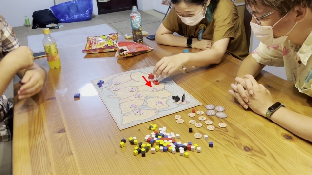 三土:3なので2個のコマをもらえるんだ。俺は青なので青いコマを2個もらいます。とりあえずこれでターン終了です!