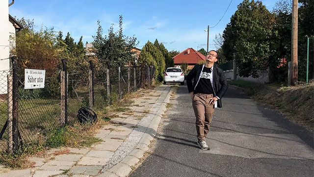すると都合のよいことに、Sátor u.の隣ブロックに青年が現れて、路上の落ち葉を掃きはじめた。