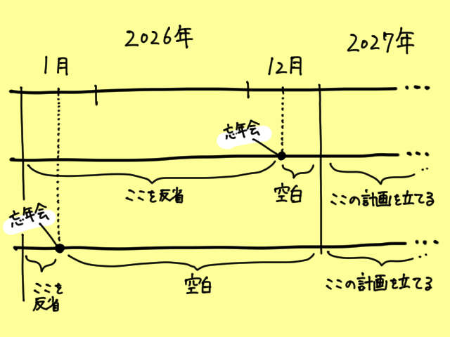 12月に催される本来の忘年会も、31日ギリギリまでその年を過ごしてから振り返っているわけではない。