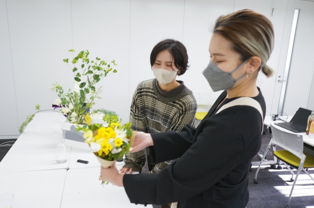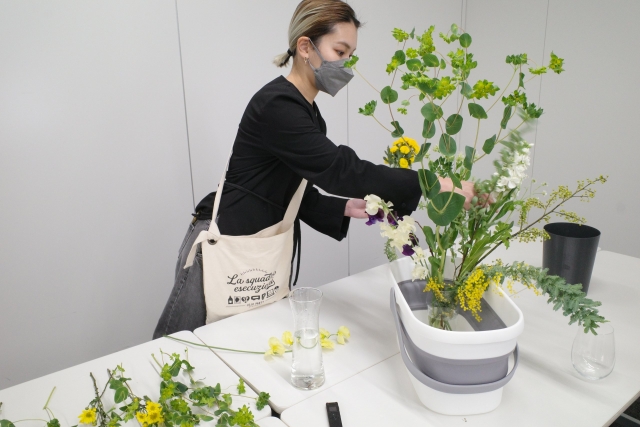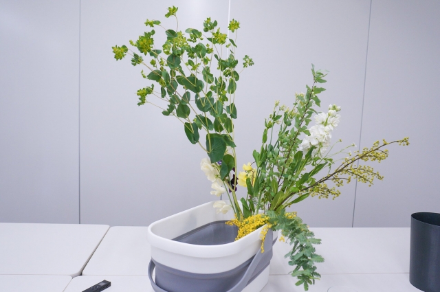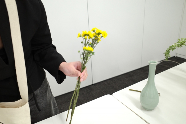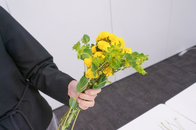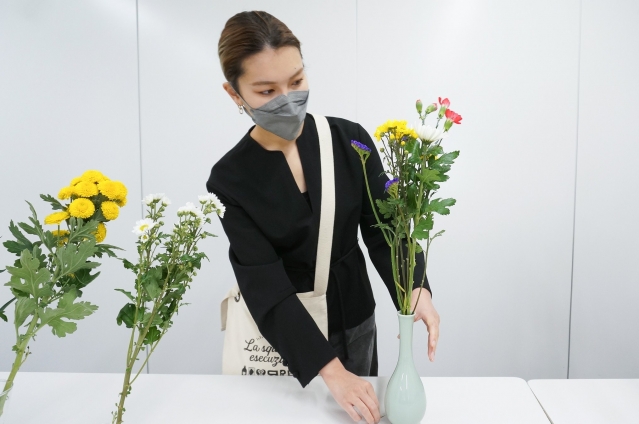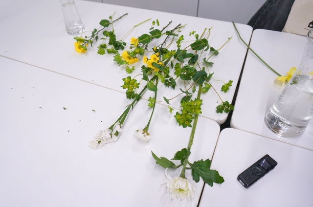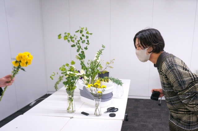 JUNERAY:このままだと縦のラインが仏花らしく見せてしまうので、お花の横にバランスを足したいですね