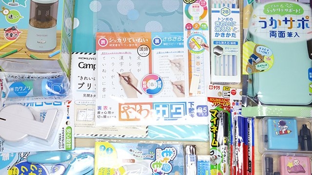 すでに30品以上の学童文房具を取り寄せては片っ端から試している。青系の製品が多いのは、姪っ子の好みの色(水色)に合わせてあるから。