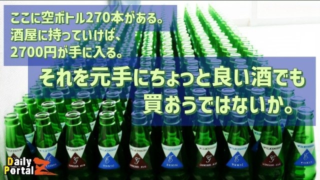 まぁ、何はともあれ、とりあえずここには空ボトル270本がある。 これを酒屋に持っていけば、2700円が手に入る。 それを元手にちょっと良い酒でも買おうではないか。