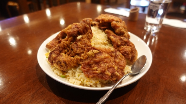 名物は唐揚げがのった鶏肉チャーハンらしい。え、そんな素敵なチャーハンがあるんですか。でも、玉子チャーハンも食べたい。