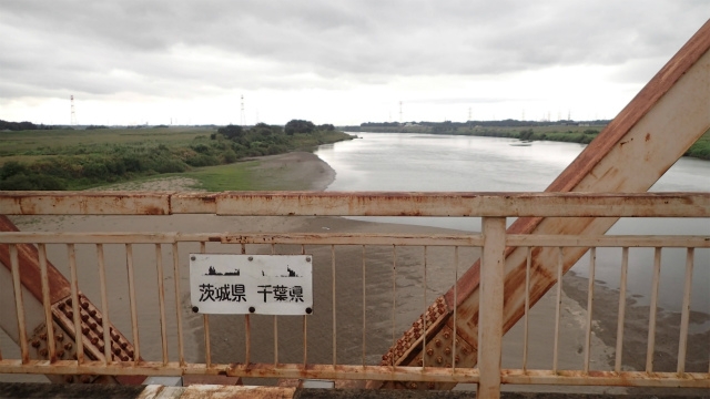 水戸街道を北上し、利根川手前で右に折れ、利根川沿いの土手の道路をしばらく東にむかうと、茨城県の県境が現れる。