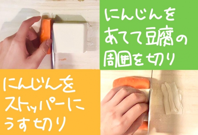 まず直方体のにんじんをあてて豆腐の端を切ります。つづいてにんじんを両端に置いて包丁のストッパーにして、均一にスライスできるようセッティング。薄く切るごとににんじんをずらしていきます。