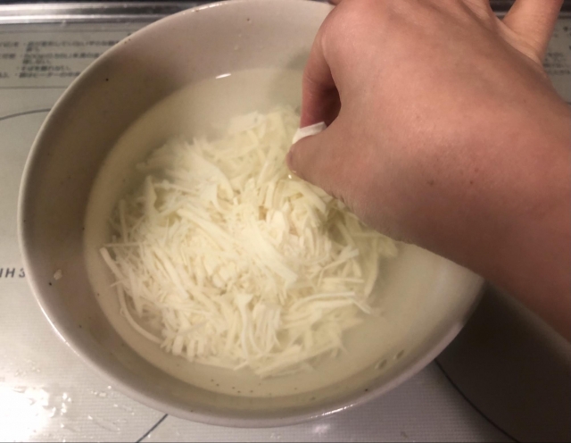 凄腕料理人は包丁さばきが均一なので、細さがそろっているのですが、私の千切り豆腐は「スライスチーズを開封した時フィルムに残ってるカケラ」みたいなのがまじっています。