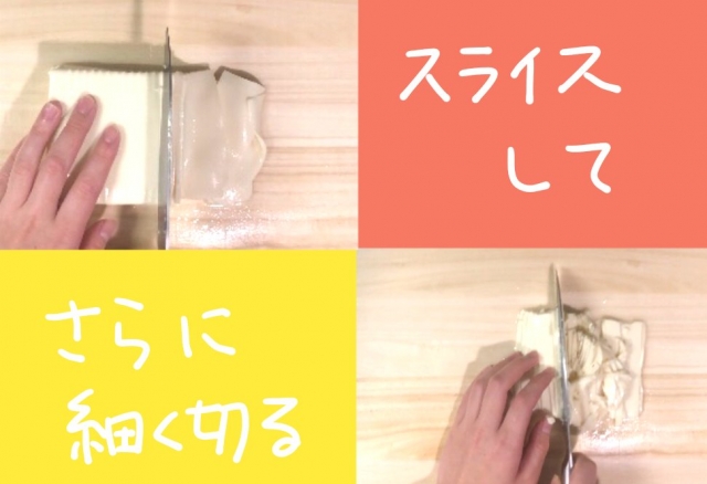 改善した点といえば、まず1回目のスライスでできた薄切り豆腐を揃えてから千切りすること、そして