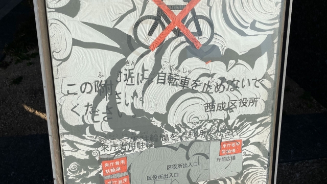 注意書き自体は普通の駐輪禁止なのですが、なぜか妙な形に劣化していて、うずまきのようにバキバキと、ちょっとグロテスクながらも癖になる壊れ方をしていました。