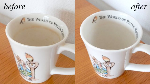 落とさなきゃなーと思うのだけど、マグカップの茶しぶを落とす作業は、僕の中で優先順位が低い。レシートの整理とかまな板の除菌とかしているうちに一日が終わる。
