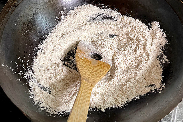 この次の工程が謎だった。小麦粉(米粉を使う場合も)を香ばしくなるまで乾煎りして、水で洗って濾すというのだ。しかもそれを三回繰り返すと書かれている。