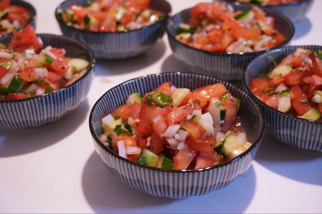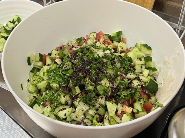 まず作るのは「Çoban Salatası」(チョバン・サラタス、意味:羊飼いのサラダ)。かつて、遊牧民が放牧中に簡単な食事として食べていたサラダだそう。
