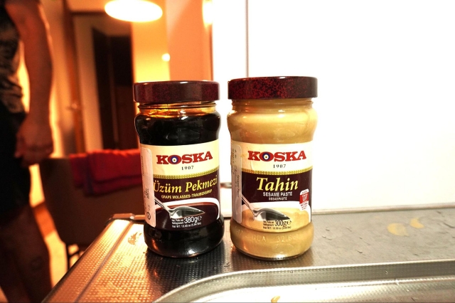 左の黒いのはÜzüm pekmezi(ユズーム・ペクメジ、意味:ブドウ糖蜜)、右のうす黄色のものはTahin(タヒニ、意味:胡麻ペースト)。