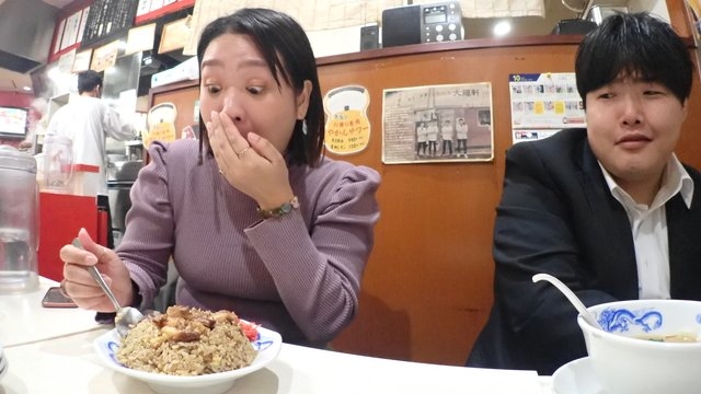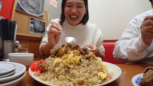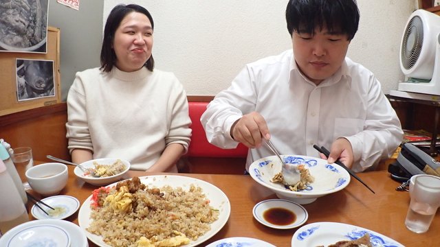やってきた炒飯を見て「こんなに食べきれないかも…」と月餅さんが言う。いや、こんなの食べきれる人、普通にいないだろう。