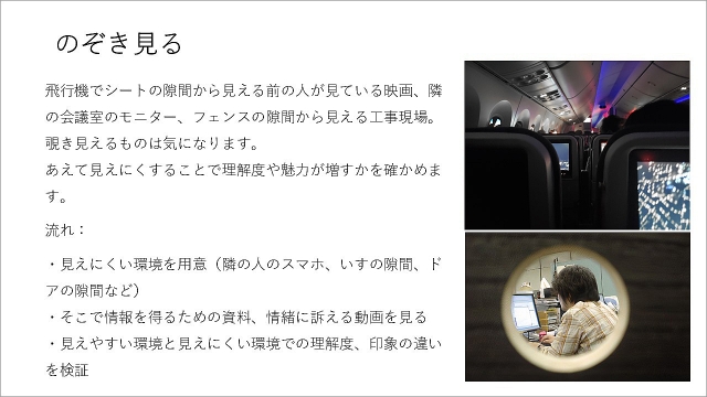 擬似的に飛行機のシートみたいなものを作って、正面で見たときと隙間で印象が変わるか。仕事の資料でも理解度を調べたい。