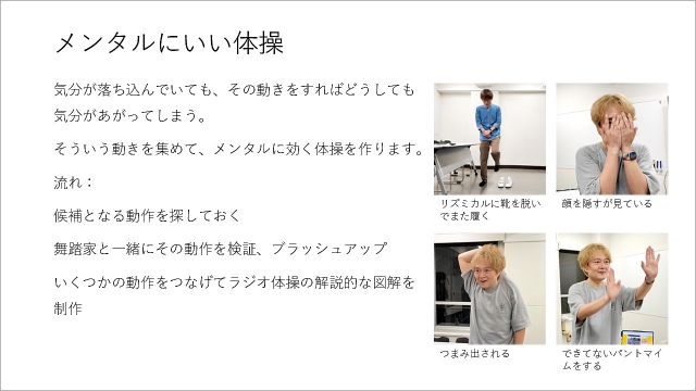 メンタルにいい体操です。気分が落ち込んでいてもそれをやるとどうやっても楽しくなっちゃう動きを集める。体から気分を変えてくれるような動きですね。