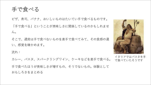 以上の議論を経て、「心の豊かさ」を検証するために「手で食べる」を行うことになった。そのようすは明日公開予定。かなり心が豊かになったことだけ予告しておきます!