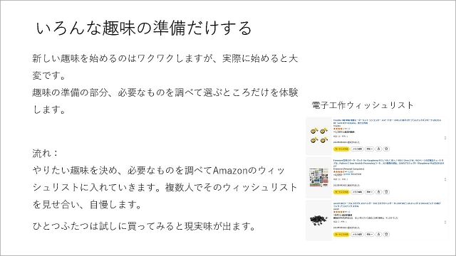 新しい趣味を始めるとワクワクするじゃないですか。実際に始めるとなると時間もいるので、やってみたかったことの必要なものを調べてウイッシュリストだけ作ってみんなで見せ合う。