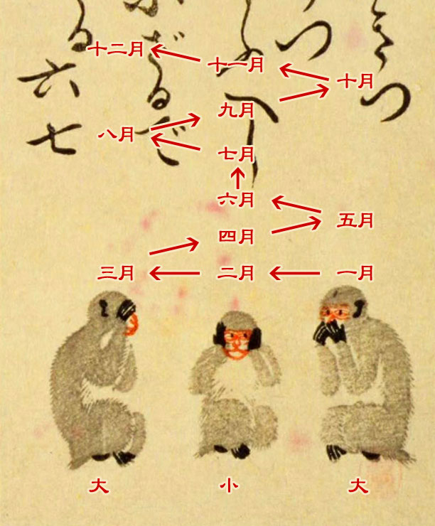 右から反復横跳びのように数えていき、中の子猿は小の月、両側の親猿は大の月とする。「中の子猿で踊る六七」とあるので、六と七は連続で子猿である。