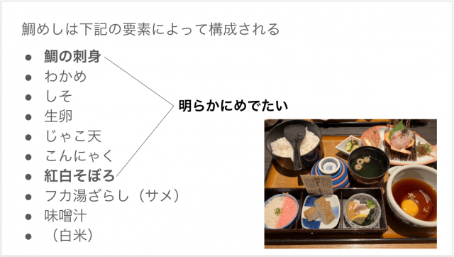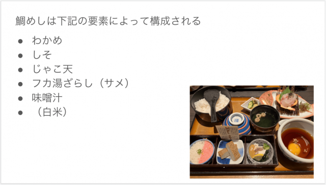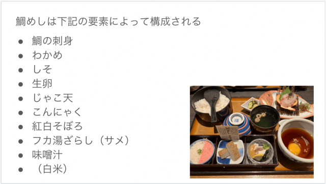 小鉢や味噌汁などを含めると、鯛めしは次のような具材で構成されている。