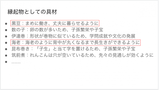 おせちに使われている具材はどれも縁起物としての意味が込められているという。海老は背中が丸くなるまで長生きできるように、れんこんは穴が空いているから先々を見通せるように......。