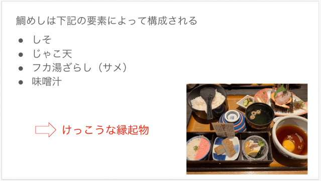 鯛めし、幕の内弁当と見てきたが、どちらも結構な縁起物であった。もう少し攻めてみてもよいかもしれない。