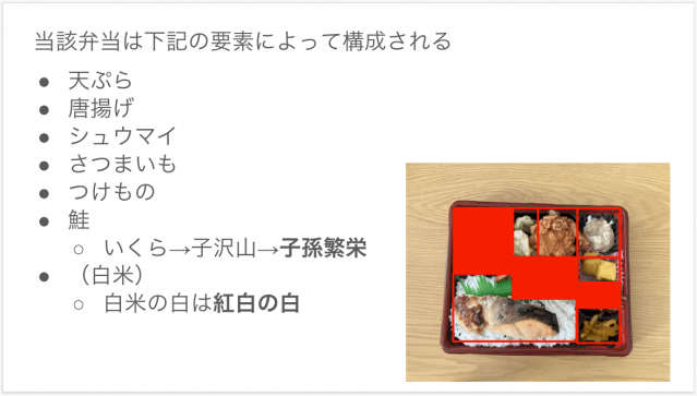 さらに「魚類は子沢山なので子孫繁栄」、「白米の白は『紅白』の白」という今までに出てきたロジックで鮭と白米が消える。