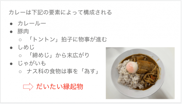 ということで茄子の是非はともかく、カレーもほとんどは縁起物という着地であった。