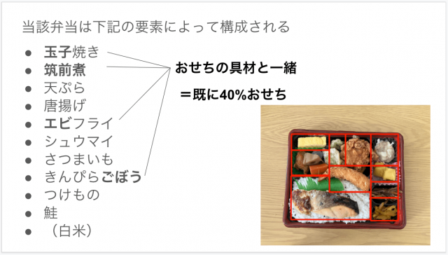 考えてみればお弁当とおせちって似ていますよね。これだけで食事を済ませようというコンセプトのもと、色んな食べ物がバランスよく詰め込まれている。