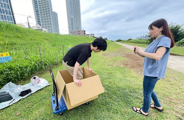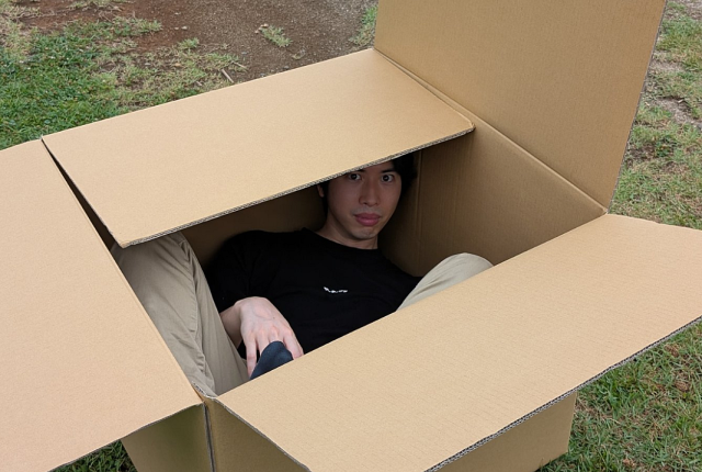 押したとき、2センチぐらいダンボールが前に出ていたのが、「体半分くらい落ちてる気持ちになった」らしい。ダンボールは人の感覚を狂わせる。