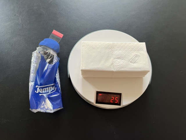 日本のティッシュが1組 0.875g のところ、ドイツのティッシュは1組 2.5g と、2.8倍の重さだった。