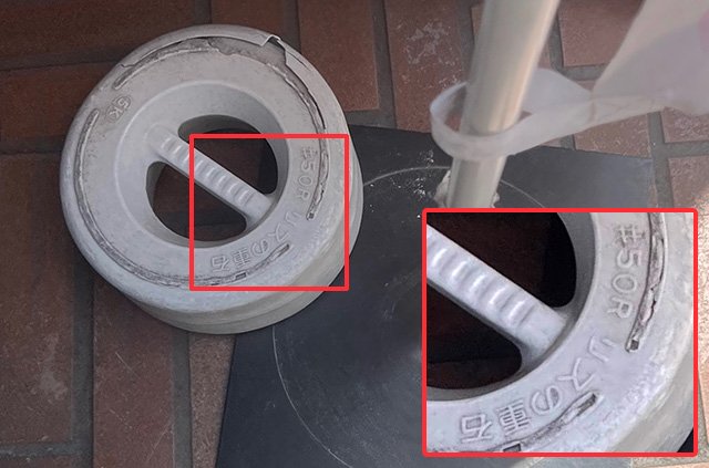 商品名で調べたら「漬物石」らしいので、屋外で使われるのは想定外かもしれない。日々紫外線を浴びているせいか、表面のプラスチックが劣化して割れている。