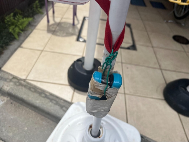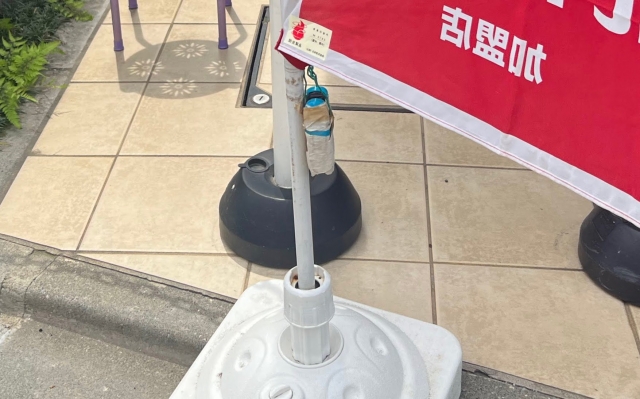 店頭イベントとかでホッチキスを使う時のために置いてあるのかなと最初は思ったが、ビニールテープがガチガチに巻かれていてはがれそうにない。のぼりが翻らないよう重しにしているだけみたいだ。