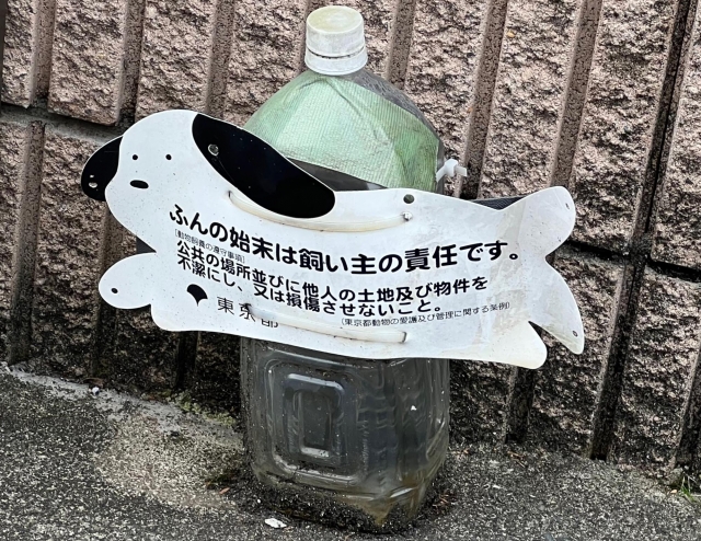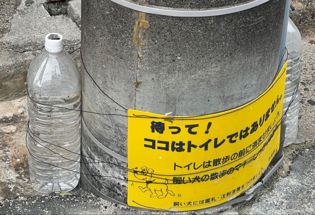 ペットボトルの隣に「待って、ここはトイレではありません」「ふんの始末は飼い主の責任です」と書かれているものもあった。ネコじゃなくて犬が描かれている。