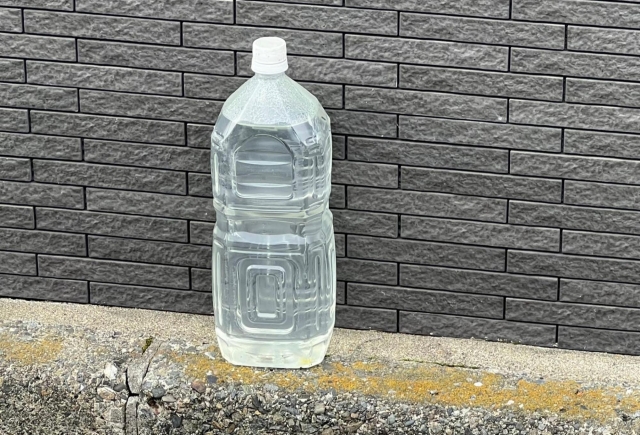 ふと足元を見ると、水が満タンに入ったペットボトルがそこかしこに置かれている。「ペットボトルがネコよけになる」と言われていたから、ネコよけだろうか。