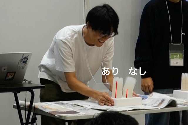 台には二つの寒天が載っている。「あり」と書いたほうには赤い線のように長い竹串が、軸方向鉄筋として刺さっている。「なし」と書いたほうは短い竹串だけで支えられている。