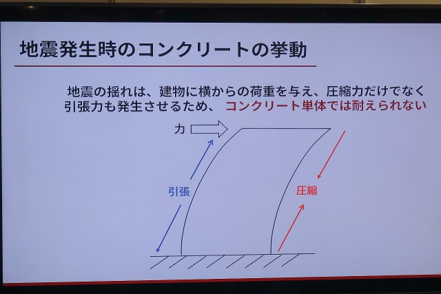 建物の構造にはコンクリートが使われるが、それだけでは地震の揺れなどには耐えられない。