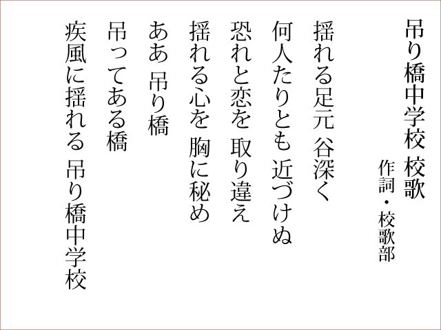 揺れる想いだとZARDっぽいから、揺れる足元にした。「ああ吊り橋、吊ってある橋」のところは中学校ではなく吊り橋の説明になっている。